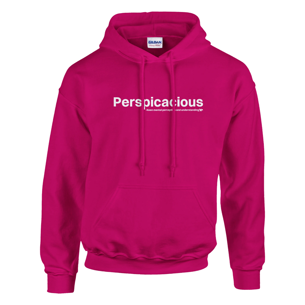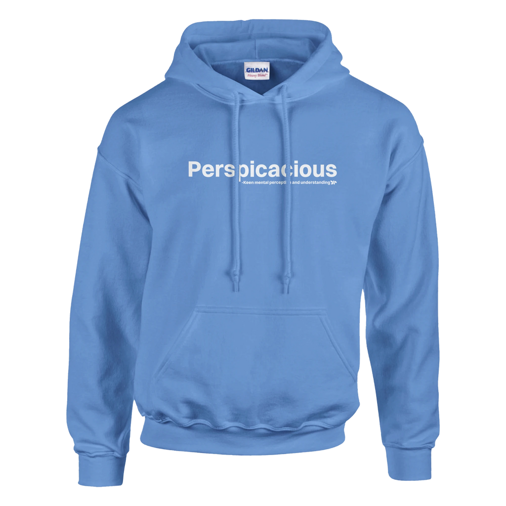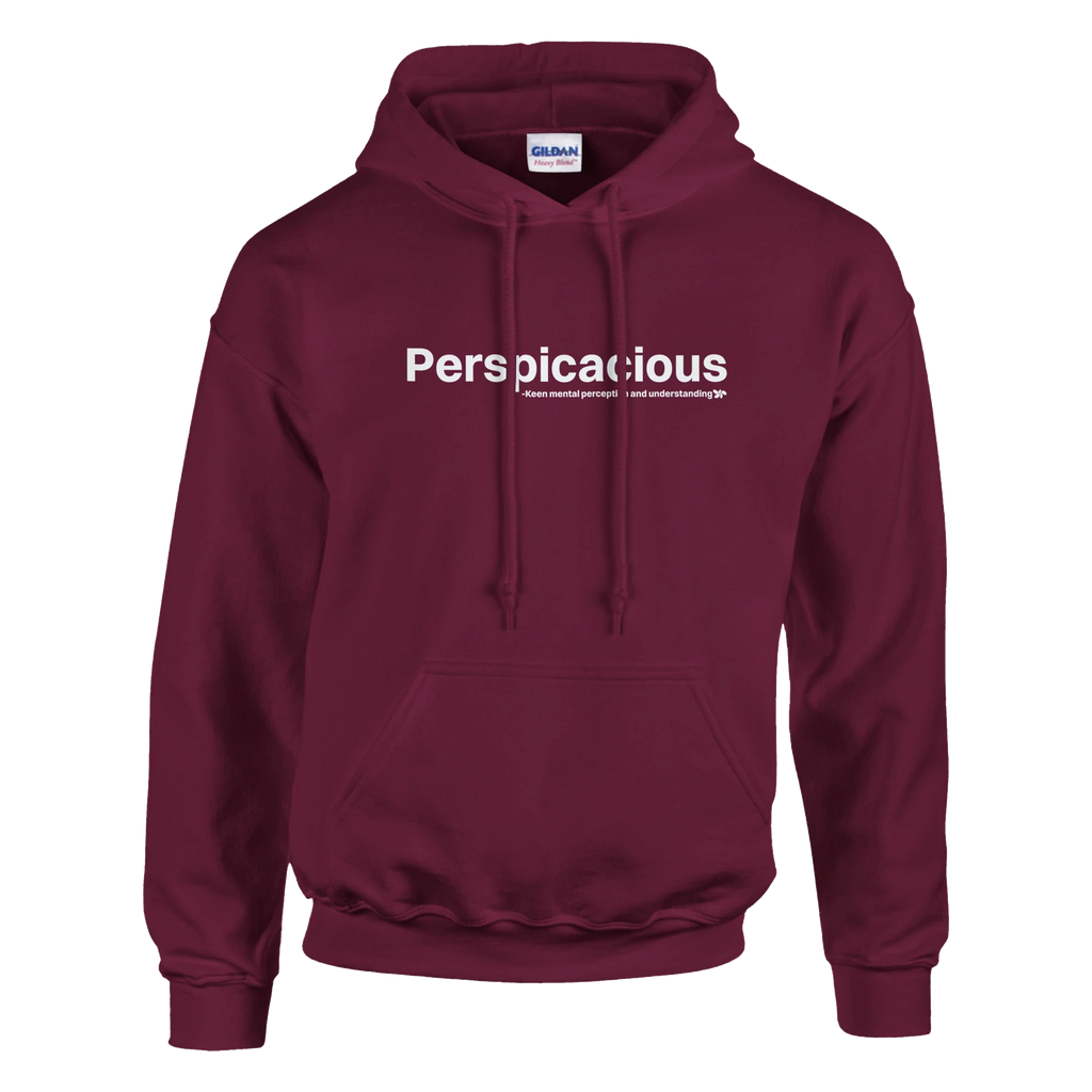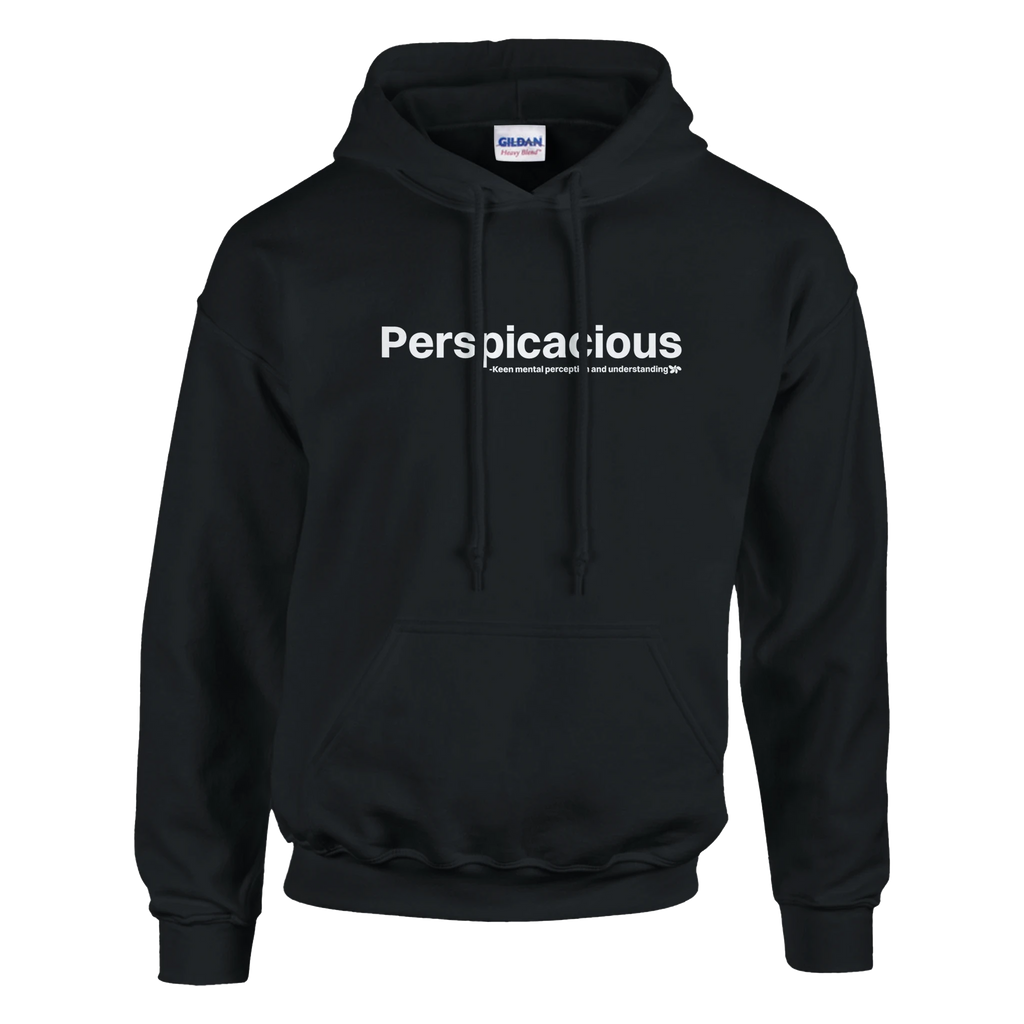 A heavy blend Perspicacious hoodie. Crafted from a soft blend of 50% cotton and 50% polyester.